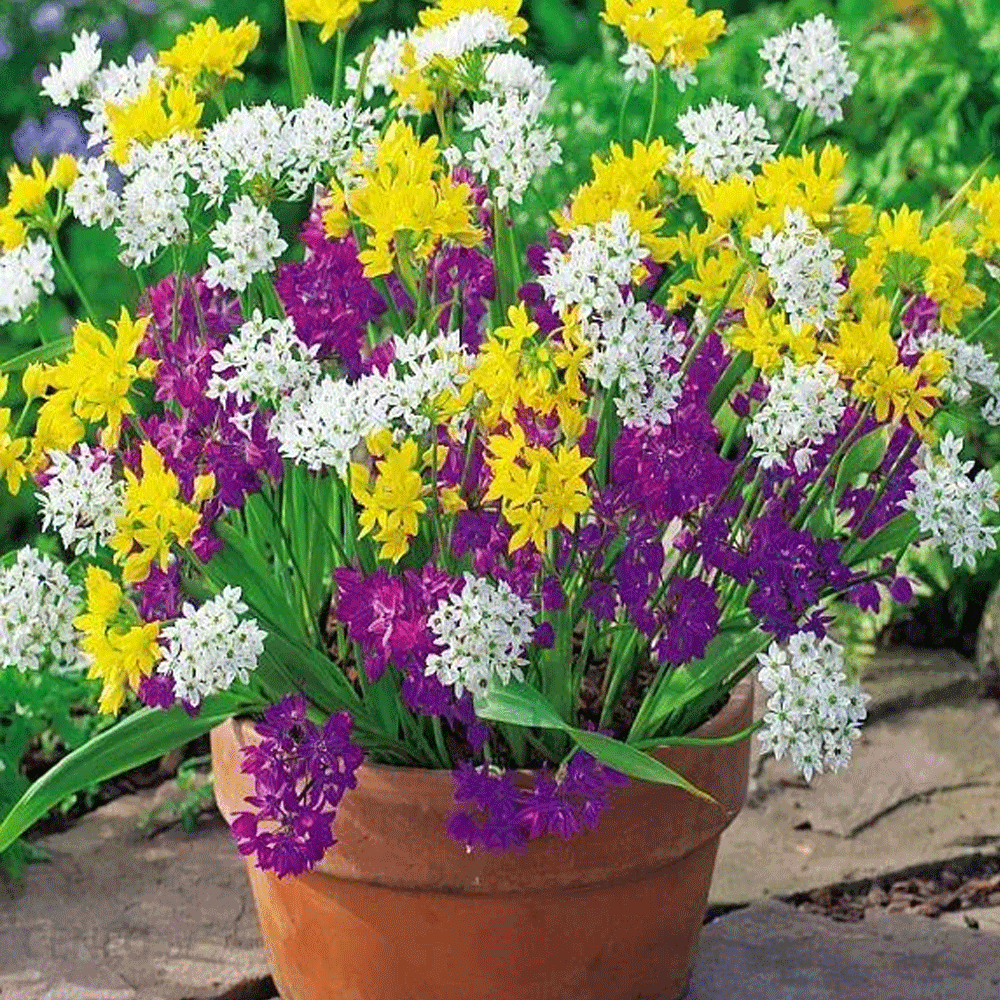 Plantati bulbi Ceapa ornamentala Mix in grupuri compacte pentru un spectacol multicolor plin de viata. Se combina perfect cu alte plante ornamentale, aducand contrast si veselie in gradina.